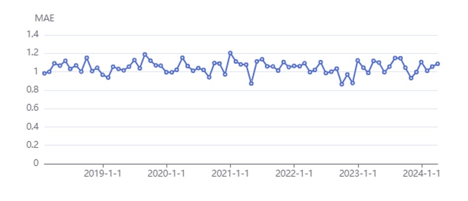 Mean absolute error (MAE) shows how close the model predictions are to the actual values. A lower MAE value means the model makes smaller errors, indicating higher accuracy of the predictions. Simply put, MAE is the average magnitude of the model’s error.
