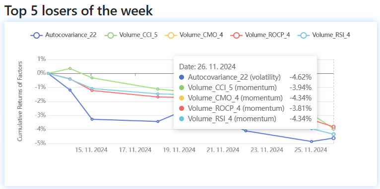 We publish reports describing which factors have earned the most in the previous 5 trading days (see our Blog). In our app, you can find reliable long-term profitable factors with good T-Statistic and P-Value.